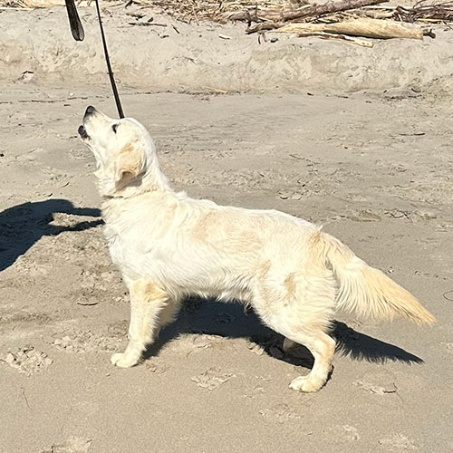 Atticus is our water dog! He is an active boy that loves to play fetch! He would be an excellent boy for an athletic family for a dog to run on the beach, go hikes, or run track. He is great on leash keeping pace and paying attention. He is social and enjoys meeting people. He can be a little rough playing so any doggie friends would need to be as big and strong. Atticus can give a bad 1st impression it take a moment for him to shine. but some playtime and a few leash walking laps and he is the happy friendly boy we know. Something we should note is he is not a CITY boy better for the typical neighborhood home and the weekend adventures. Atticus has that playful spirit that needs a family looking to have fun! He love the water and has been caught playing in and jumping into the pool! Atticus has been great with the other dogs and tolerant of kids. Atticus can be shy at first or startled by “scary things” but he is a great boy who is already getting comfortable on leash. Atticus not a big fan of being pinched or grabbed so not ideal for toddlers, but he’s good for school age kids. He enjoys carrying his toys and is a playful pup. While Atticus Will follow treats he loses focuses and needs a bit more coaching; he will take time and patience. Needs time to warm up to new people/places but is a happy sweet boy. He can be independent happy to relax and amuse himself with toys and things to chew on. Over all a good pet.