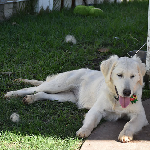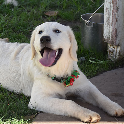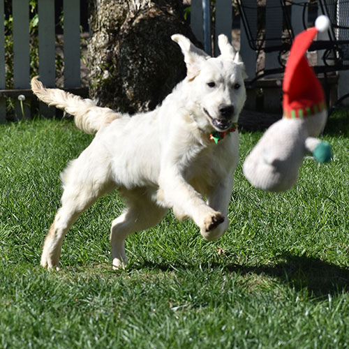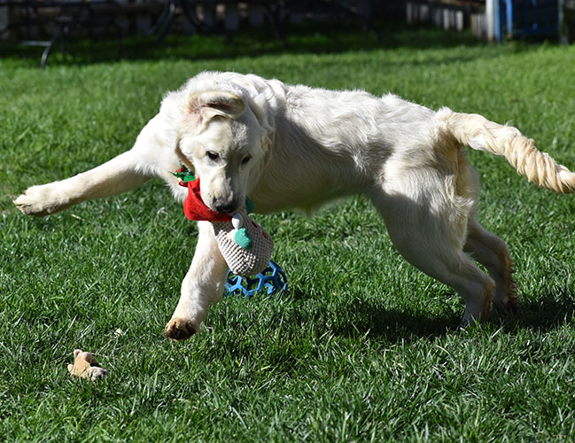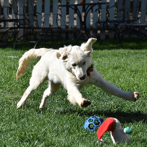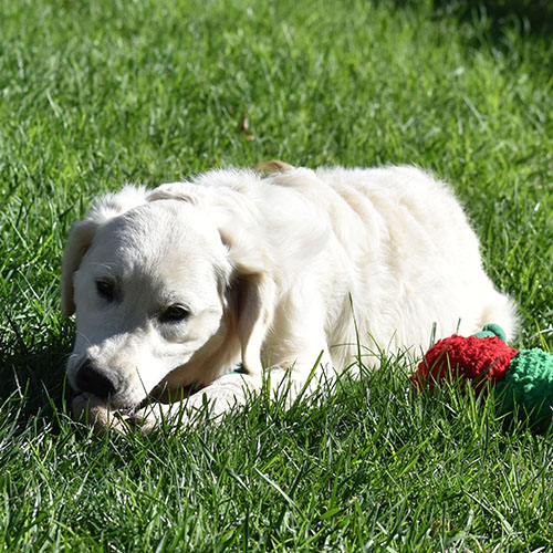 Felicia loves children. She enjoys all the toys like the Hollee Rollers, stuffies, and really blooms around children. Our sensitive Felicia can be shy at first but once she is settled she enjoy toys and will talk with them in her mouth. She has a more submissive nature so a quieter home is better. She’s lower energy and would do good with another older dog to hang out with. She would love to be in a home with kids. Felicia is an active girl that will talk/ sing song bark. She can be very kissy and affection more of that homebody likes her routines lady.